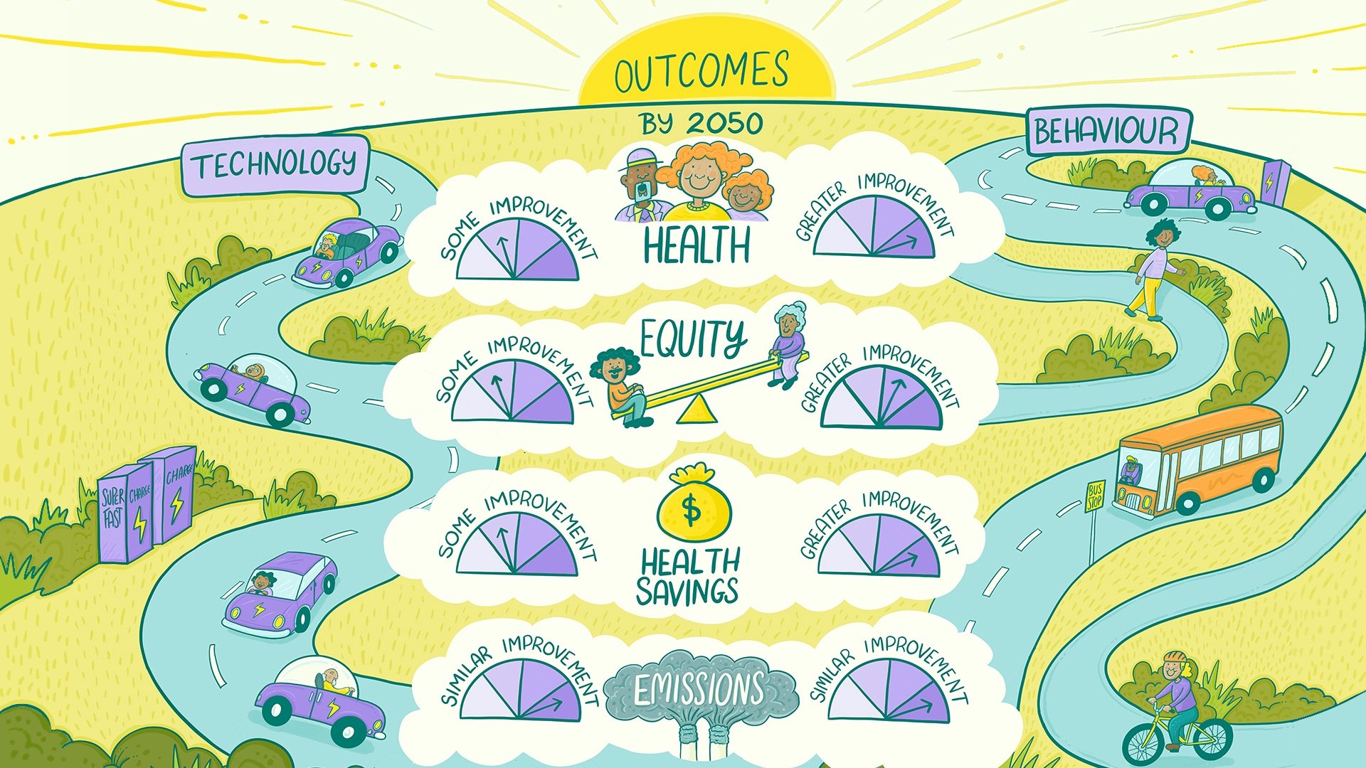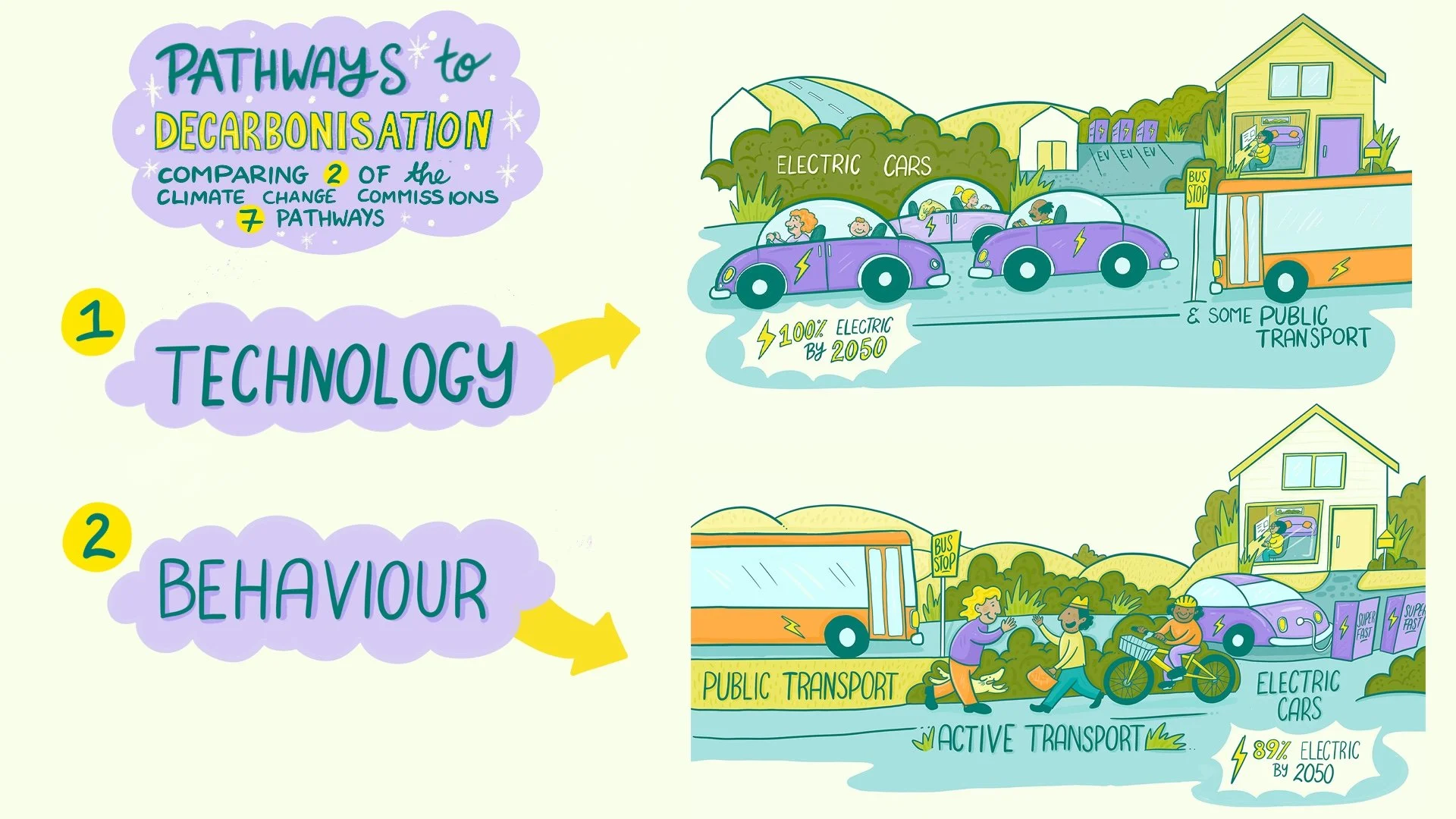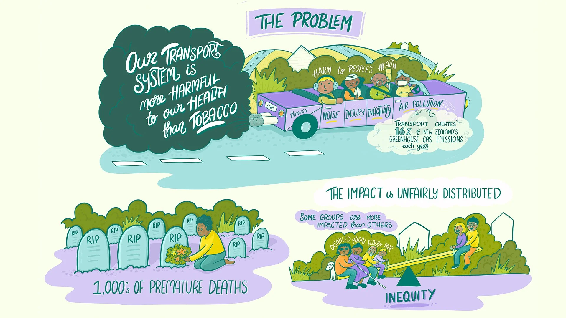 It was a pleasure to work with Dr Caroline Shaw from the University of Otago to visually summarise complex health modelling into two of the Climate Change Commission's pathways to net zero transport in Aotearoa. A transport system that prioritises public and active transport is better for all of us - and these illustrations show why.
