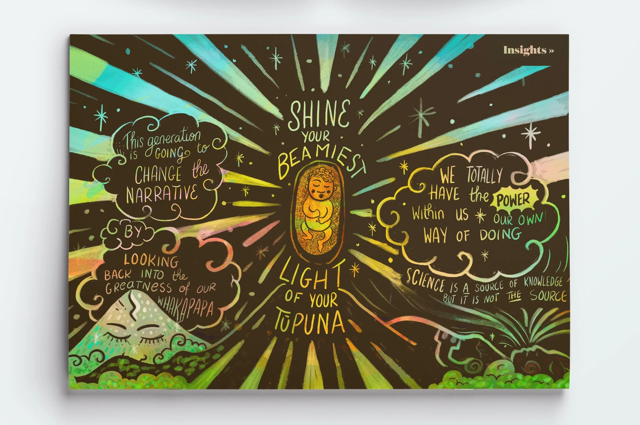 The wairua and magic of the hui was integral to the work of the kaimahi, so I wanted to bring that through using handpainted textures, visual devices, quotes, and illustration.