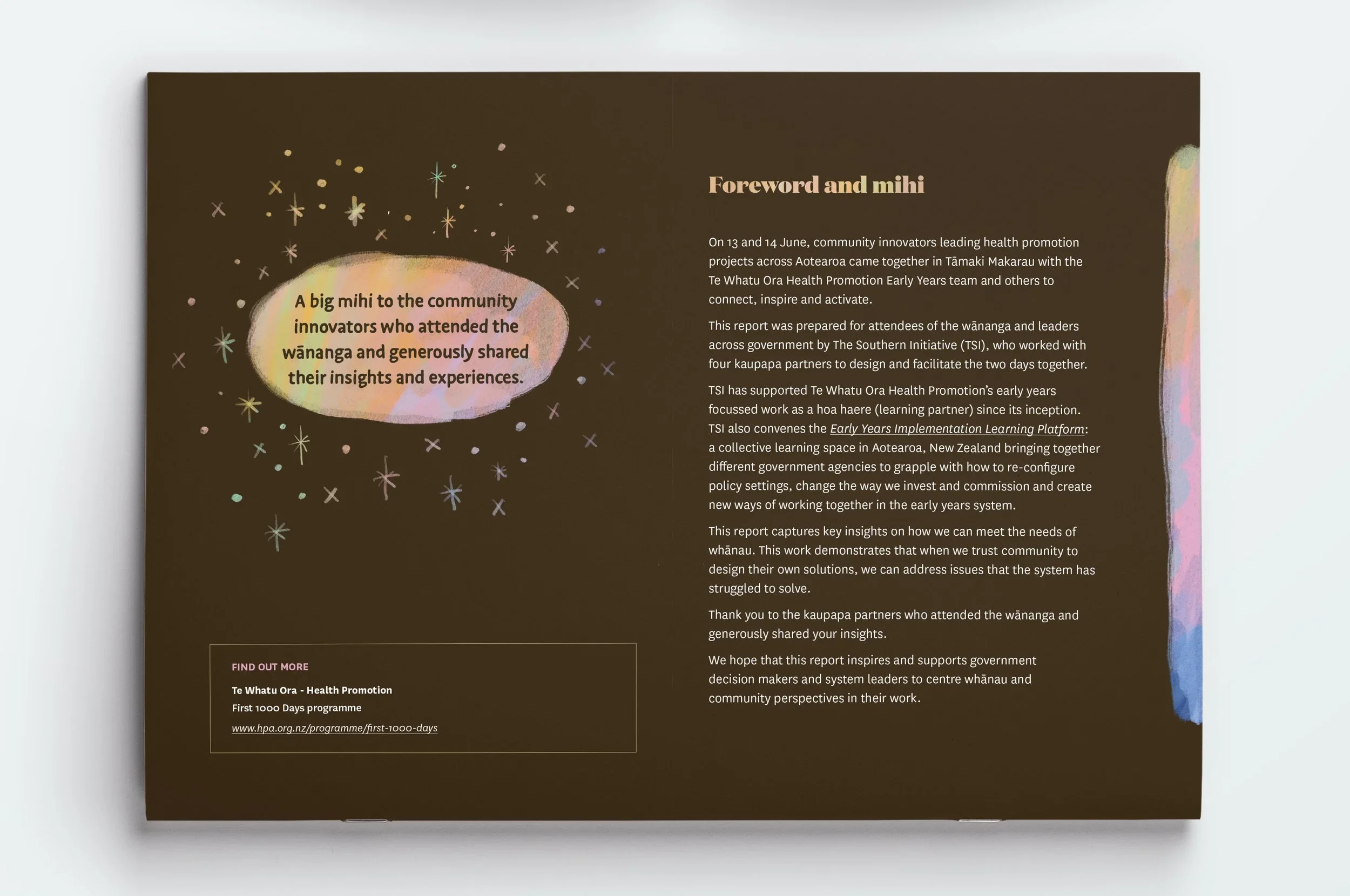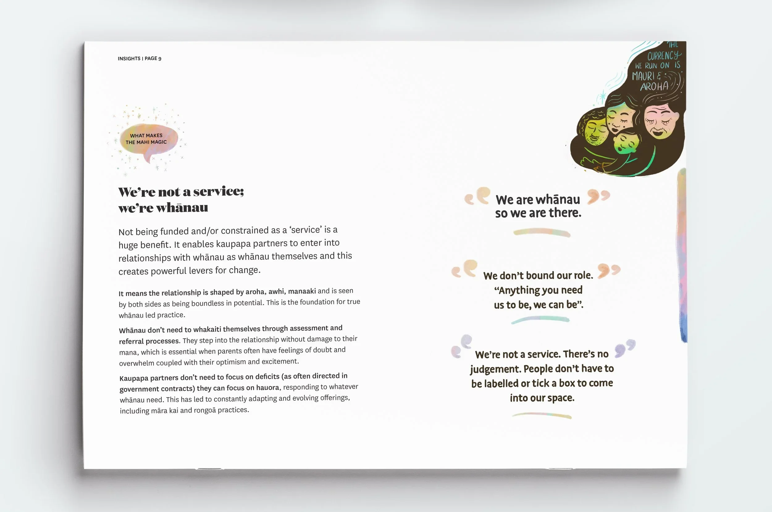 An illustrated report created as a koha to give back to the kaupapa Māori kaimahi who shared their stories, knowledge, and care during the Early Years Wānanga.