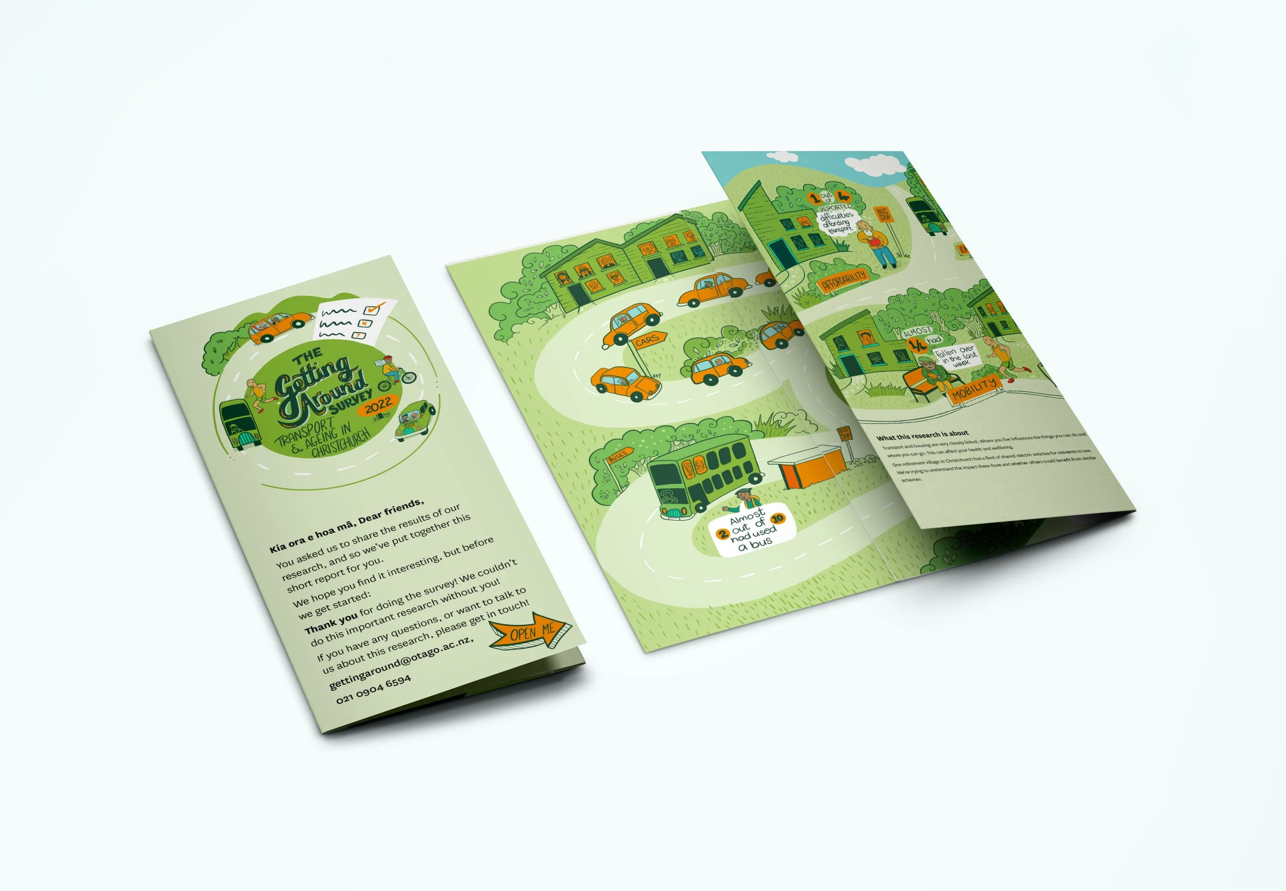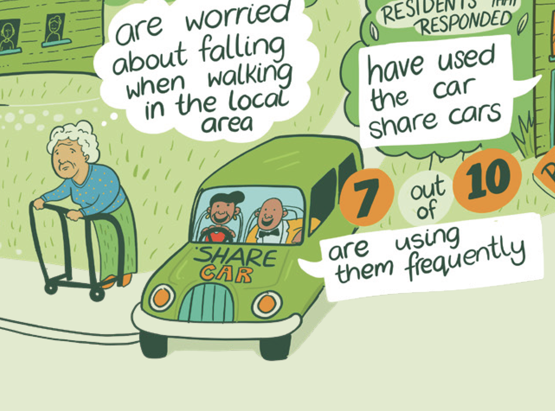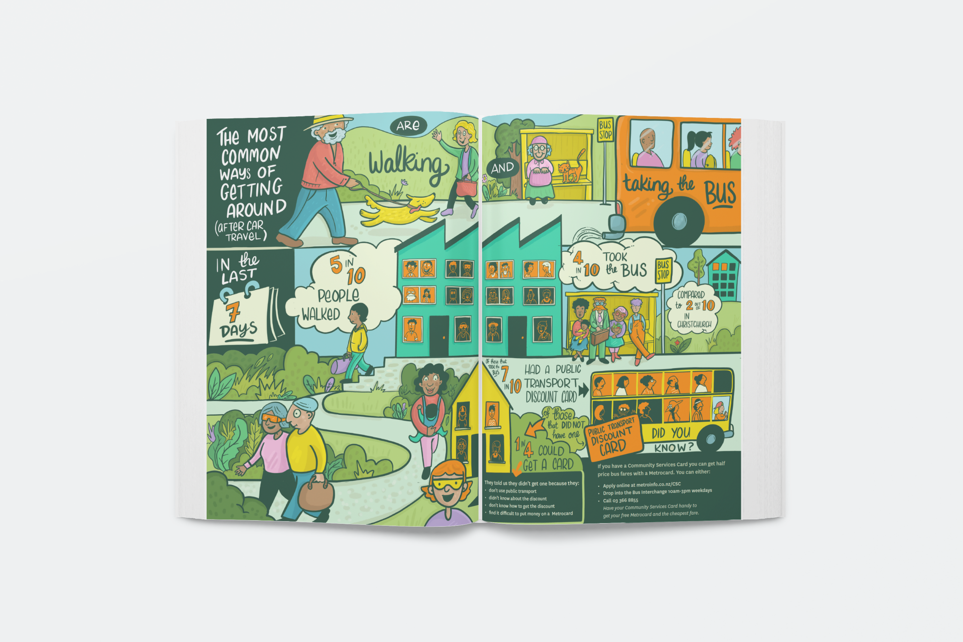 Working with social scientists, we turned transport survey findings for social housing residents into illustrated resources designed to be understood across different literacy levels and language backgrounds. Grounding the data in its real-life context, with characters and a bit of humour, makes the numbers mean something to the people they're about.