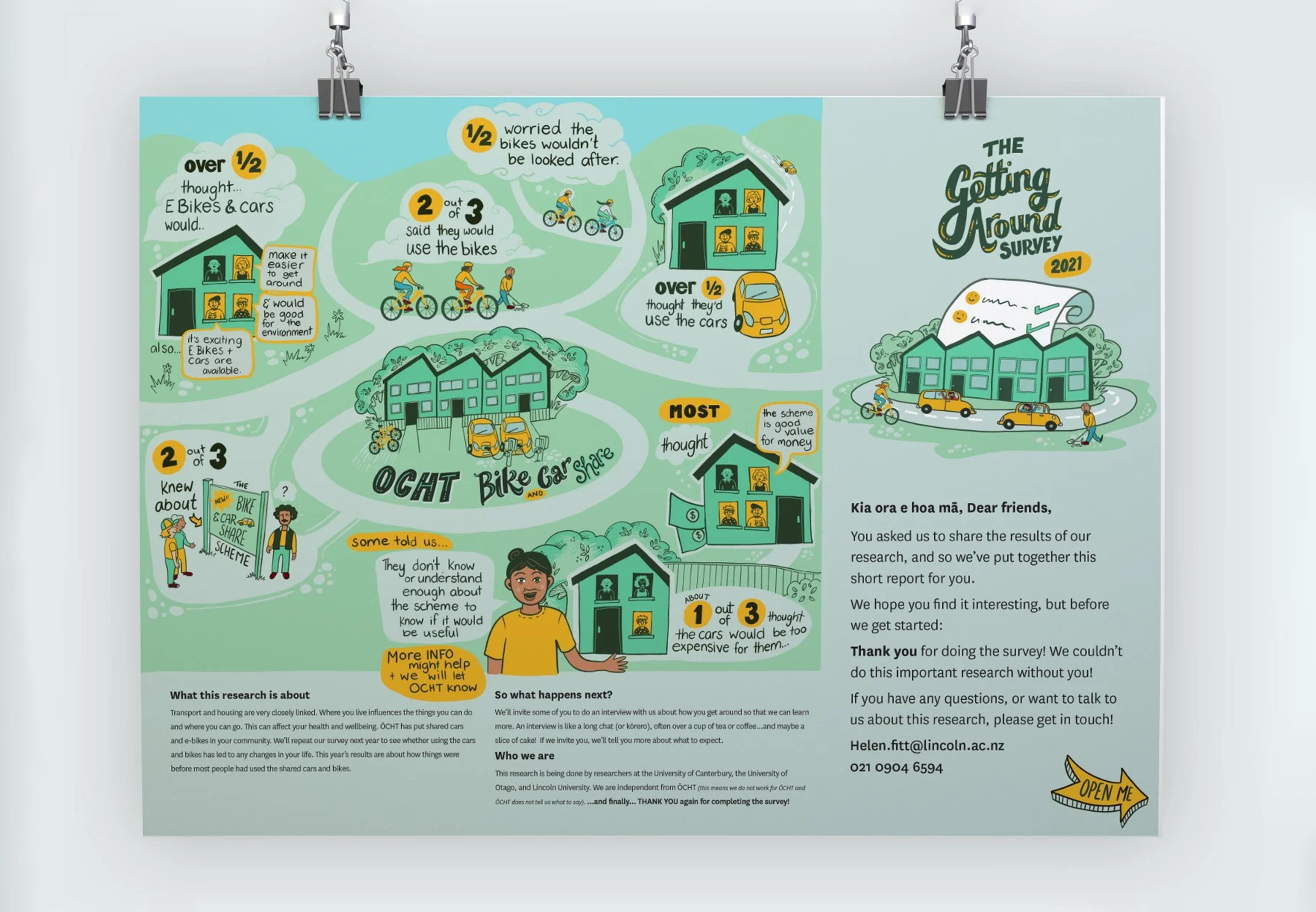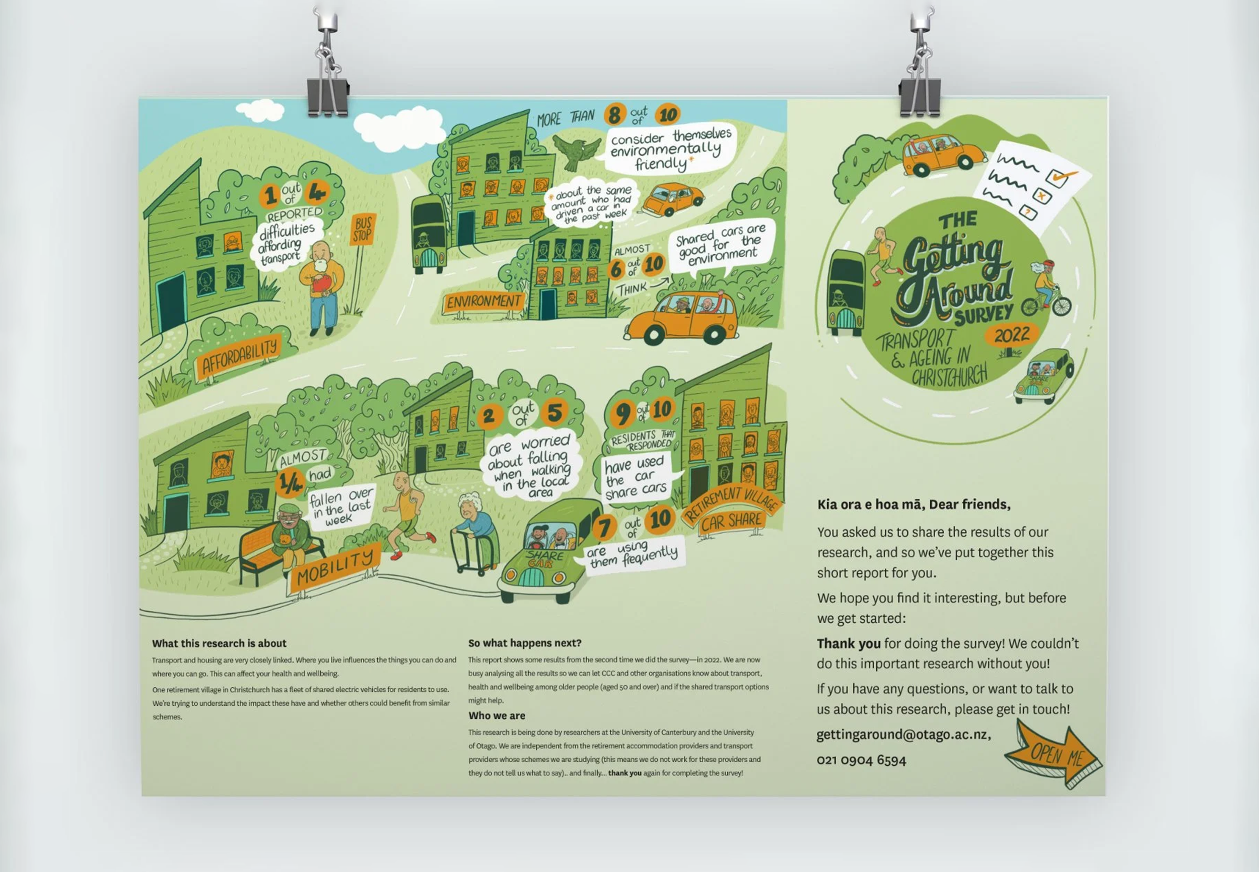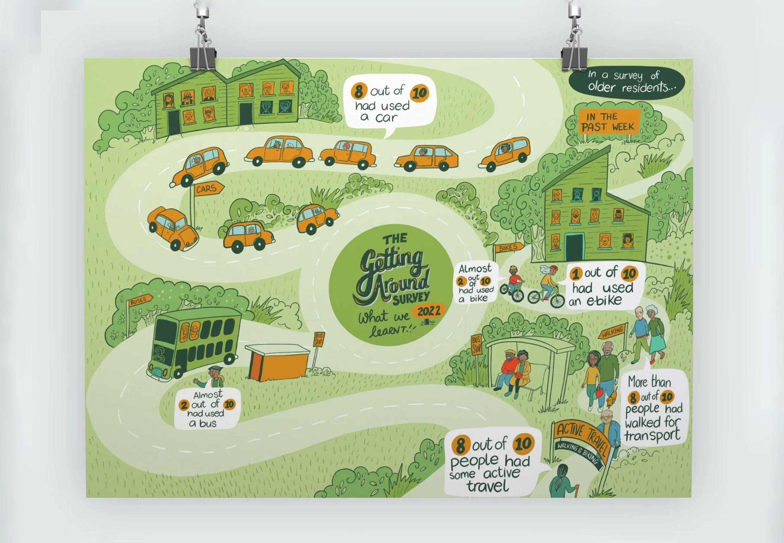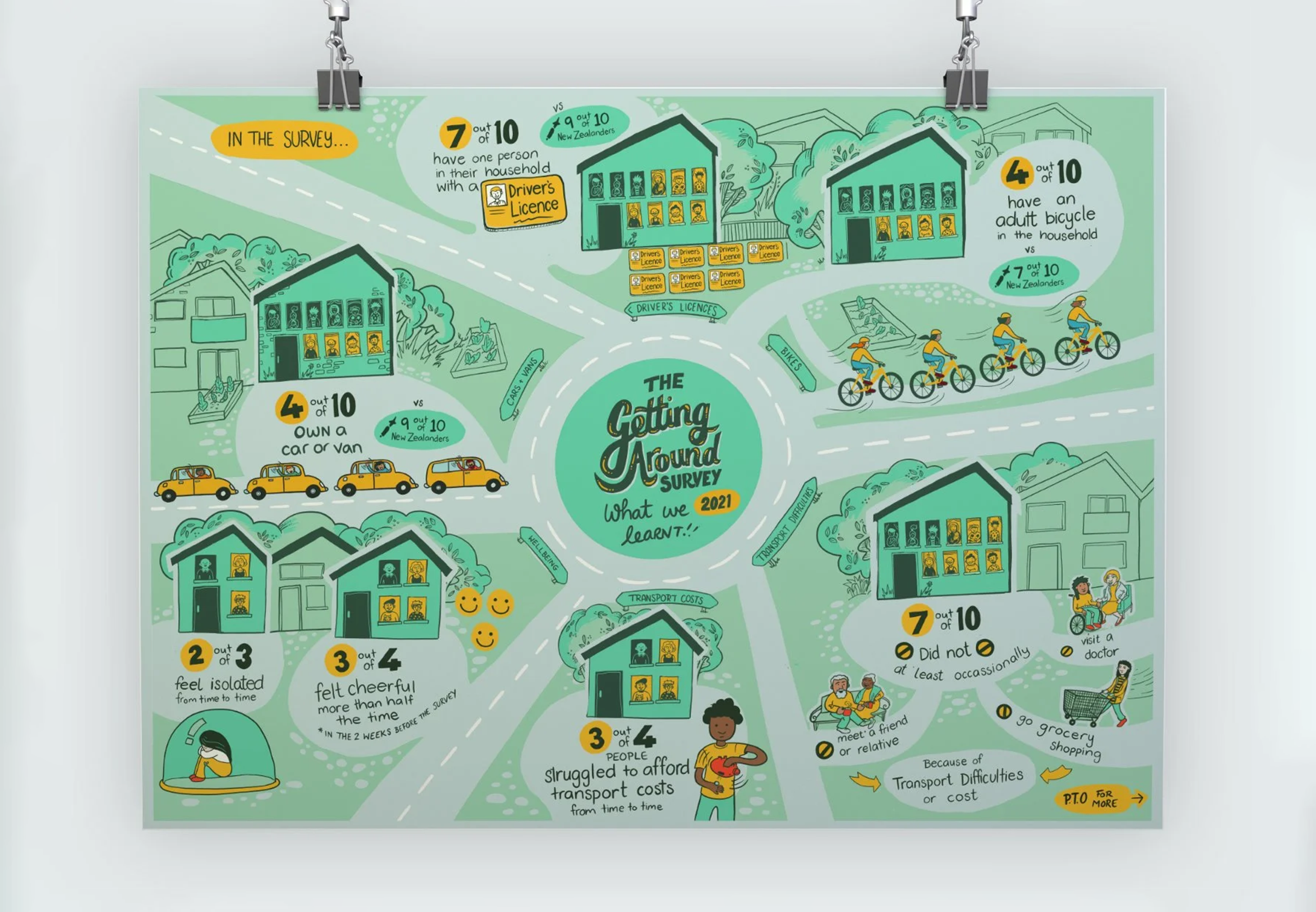 Working with social scientists, we turned transport survey findings for social housing residents into illustrated resources designed to be understood across different literacy levels and language backgrounds. Grounding the data in its real-life context, with characters and a bit of humour, makes the numbers mean something to the people they're about.