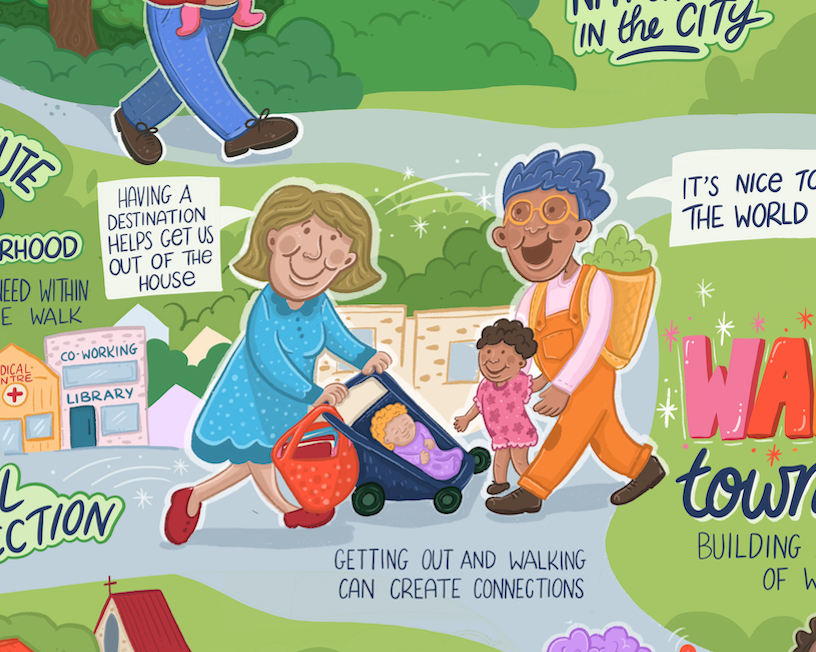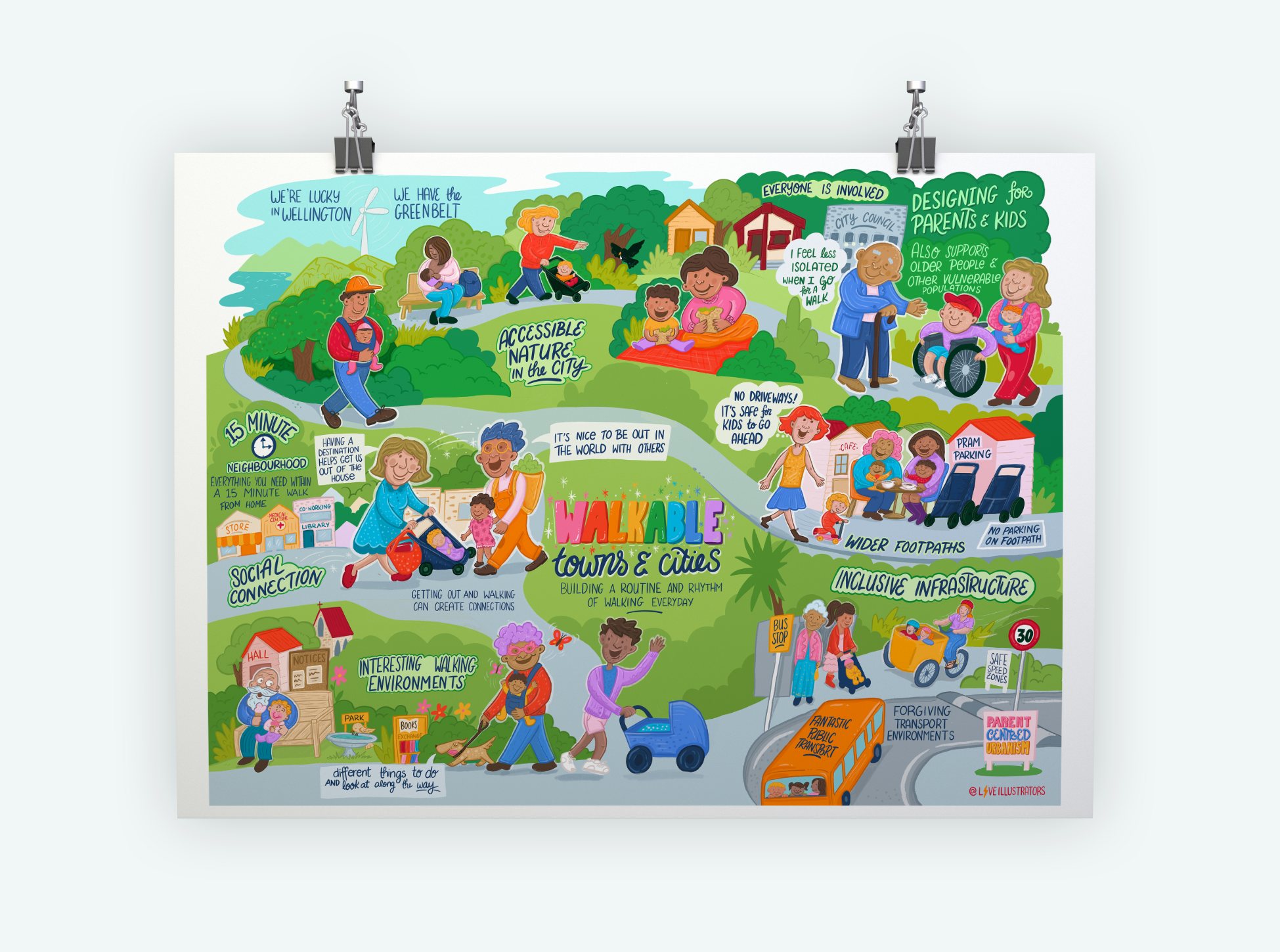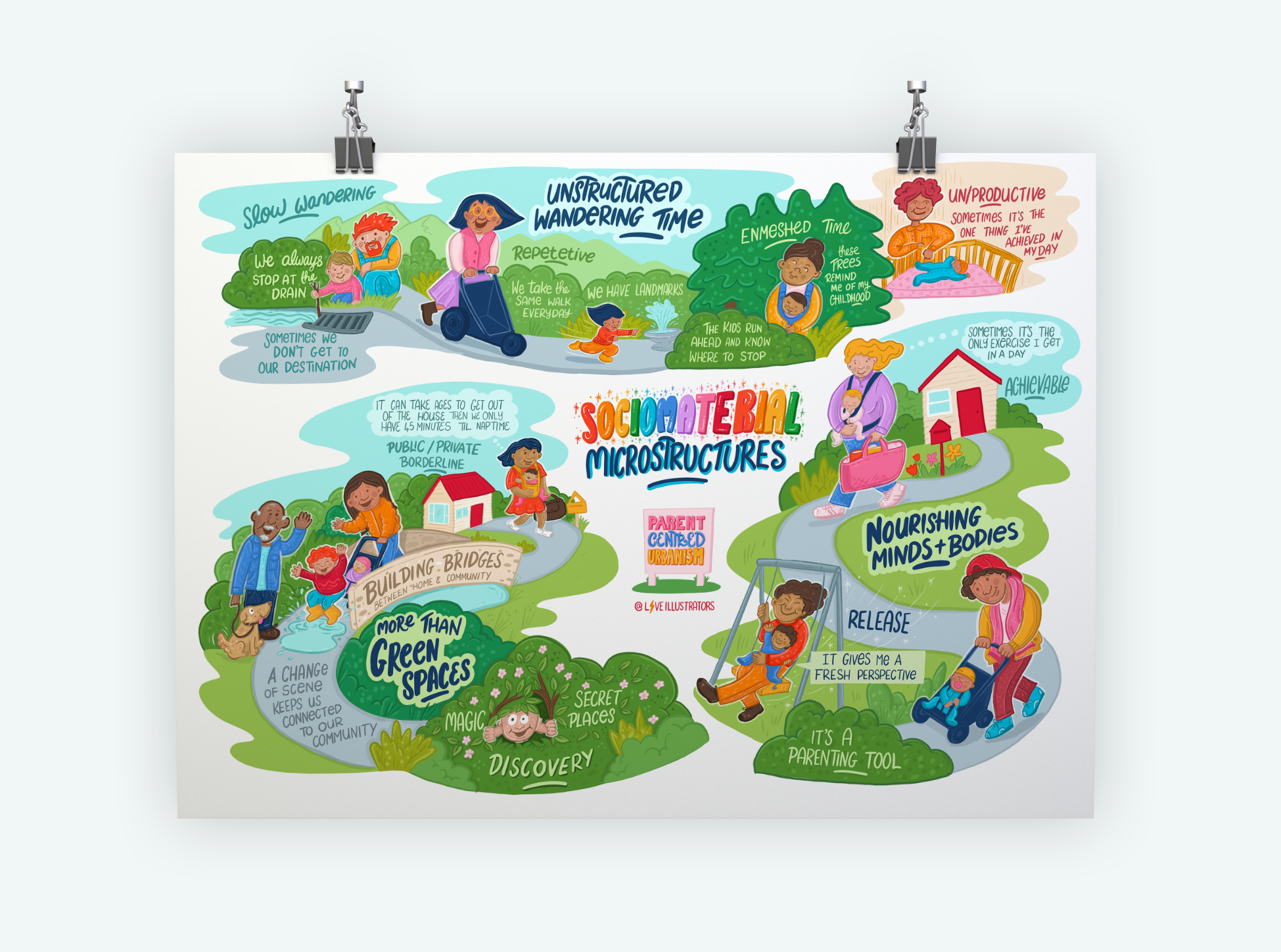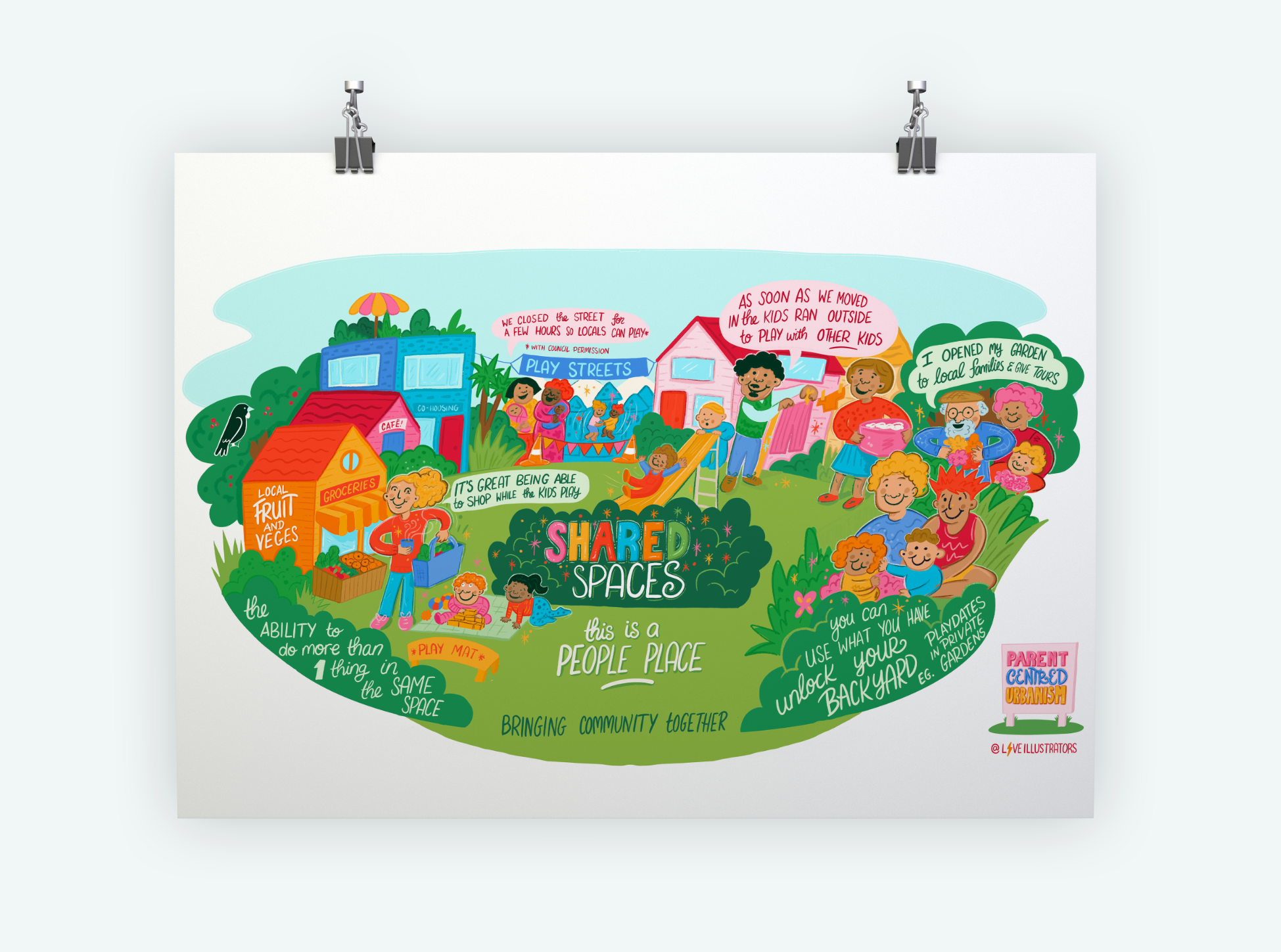 What makes a city work for families isn't always obvious until you ask the people living it. As part of my live illustration practice with the League of Live Illustrators, I captured community conversations in real time, listening to parents describe their neighbourhoods, their needs and their daily realities. Those live sketches were then refined into a series of fully illustrated research outputs.