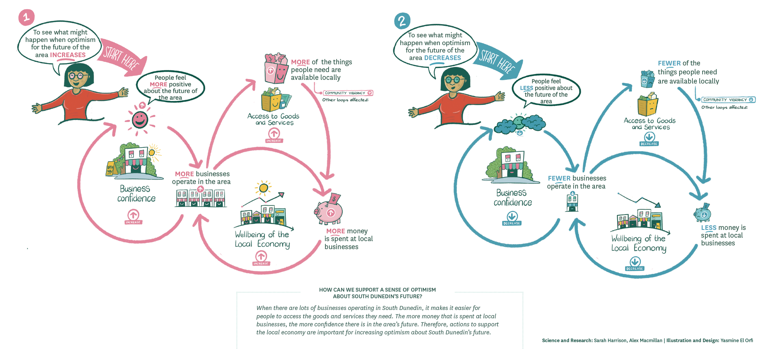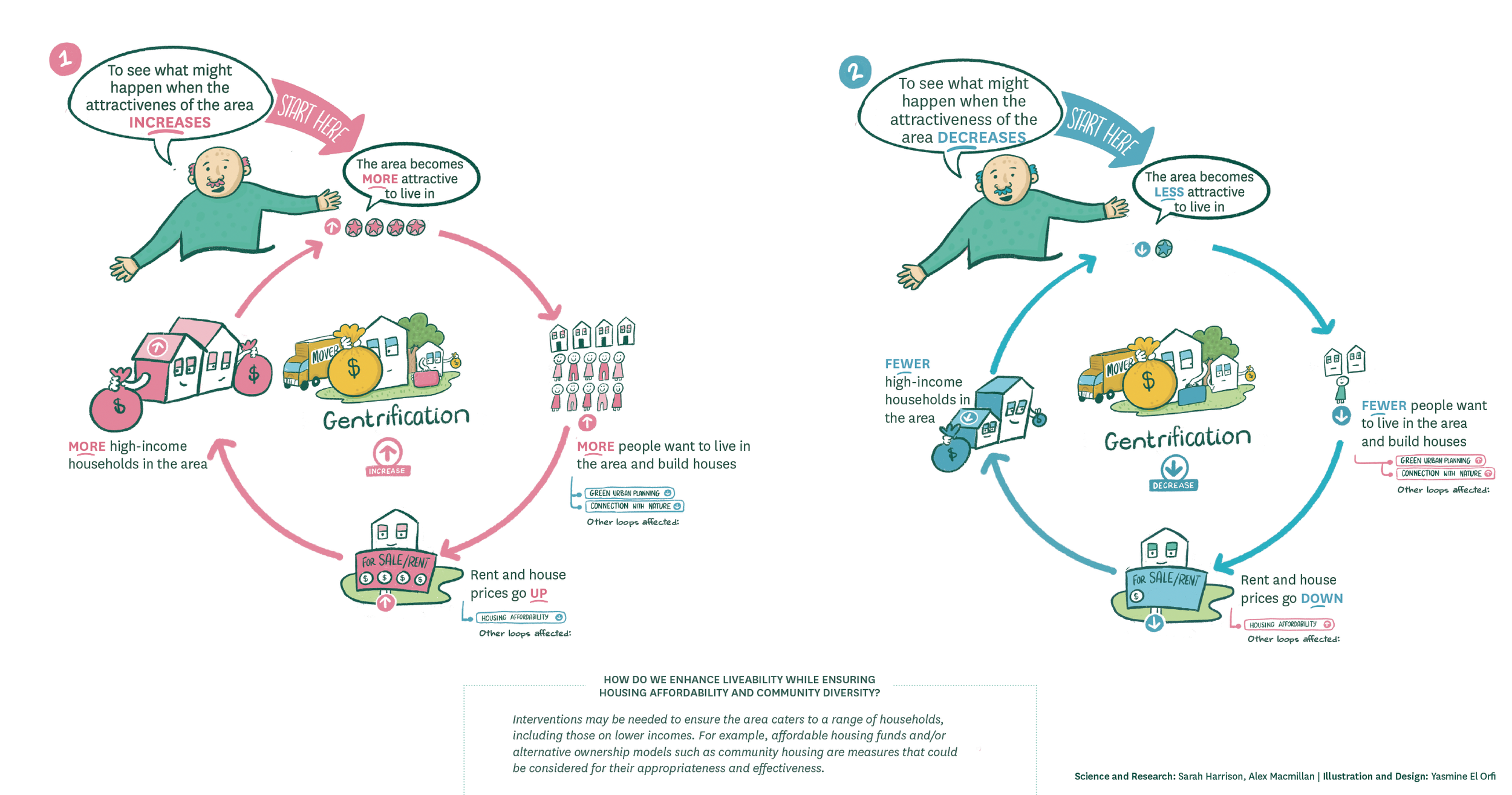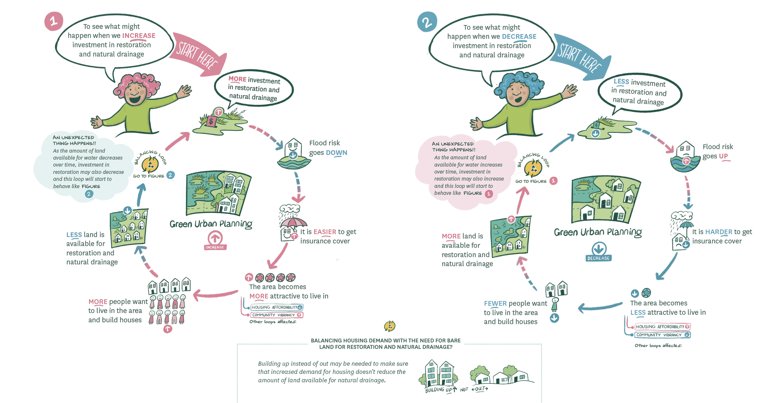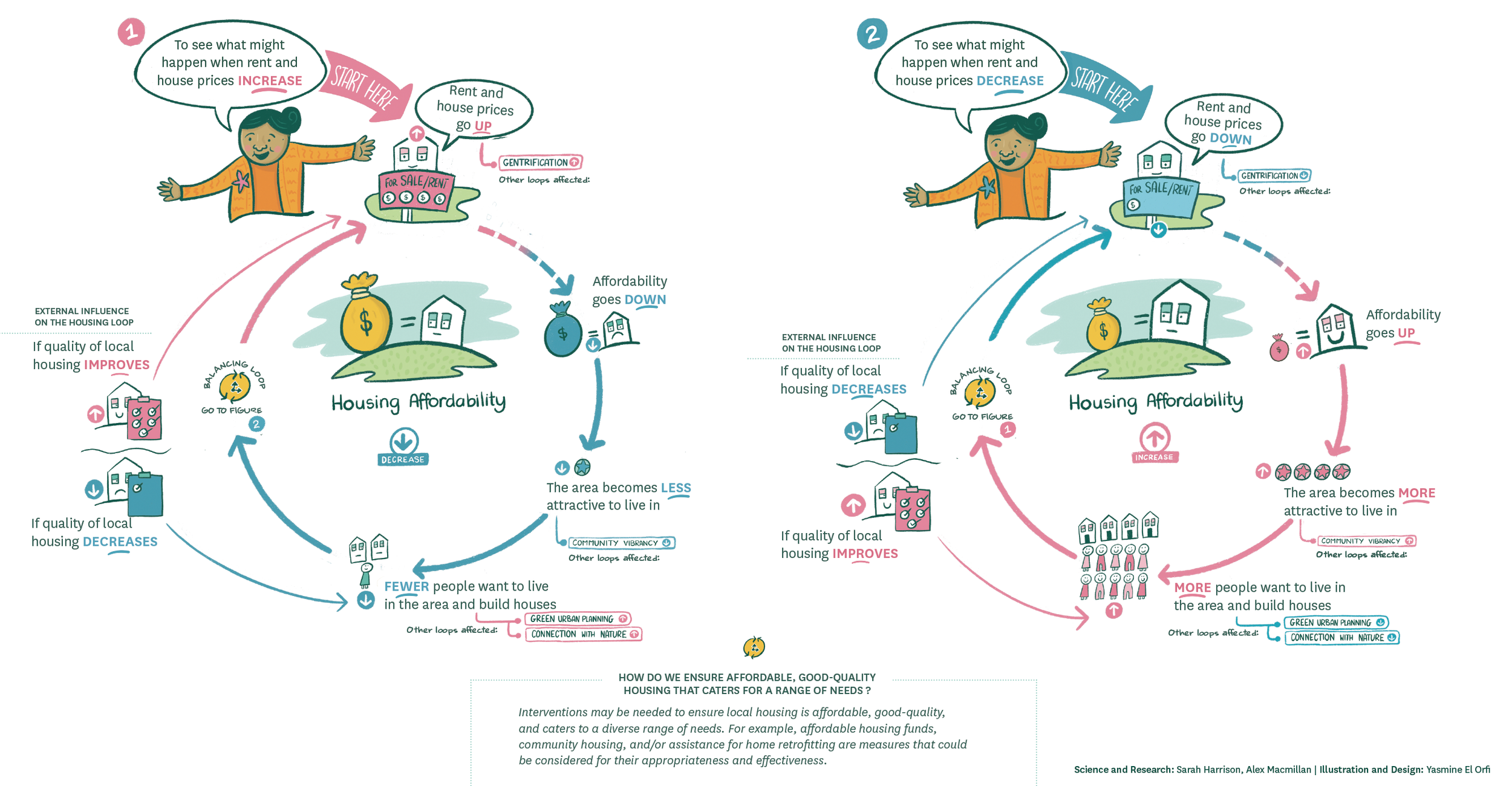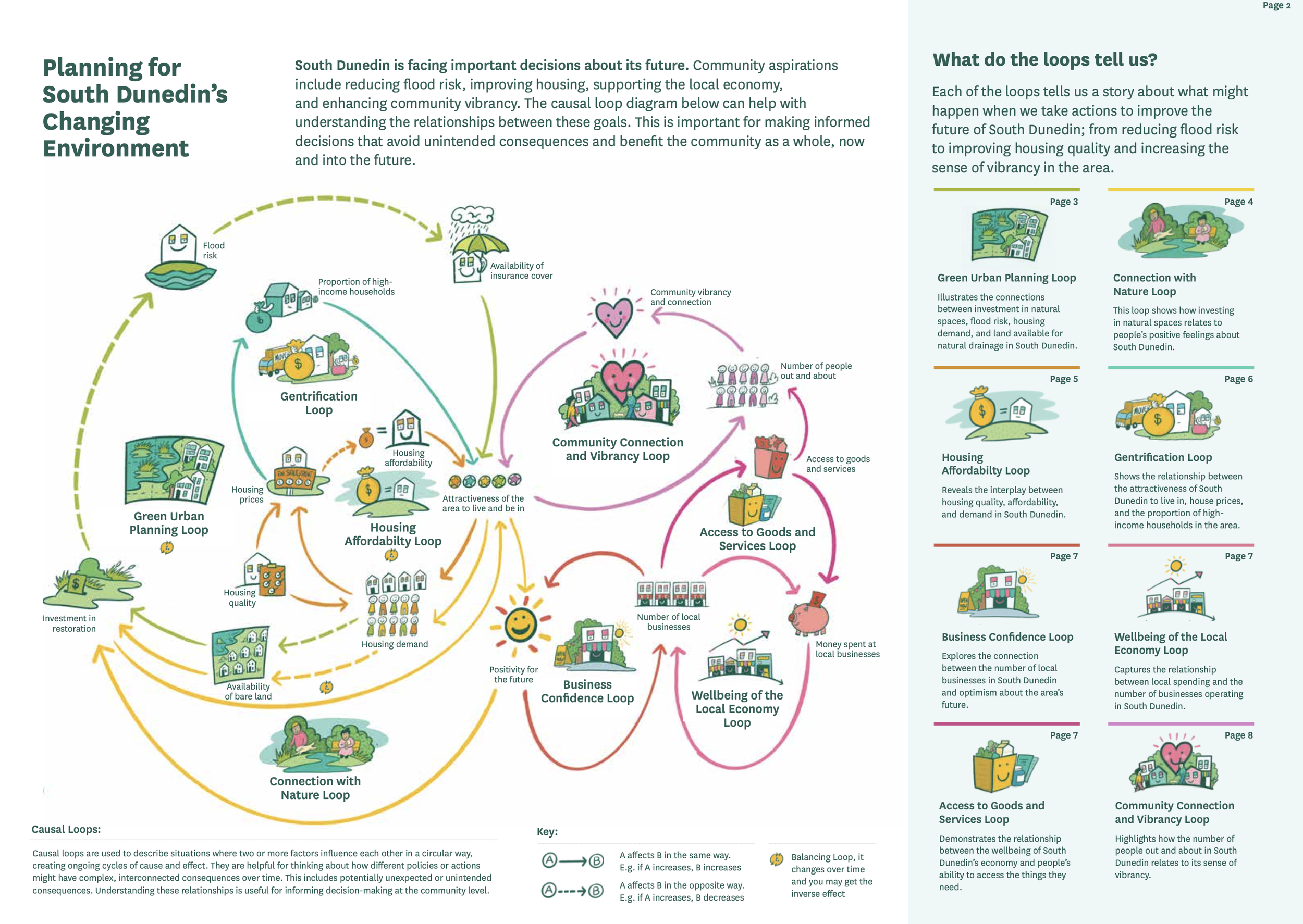 Causal loops are used to describe situations where two or more factors influence each other in a circular way, creating ongoing cycles of cause and effect. They are helpful for thinking about how different policies or actions might have complex, interconnected consequences over time. This includes potentially unexpected or unintended consequences. Understanding these relationships is useful for informing decision-making at the community level.