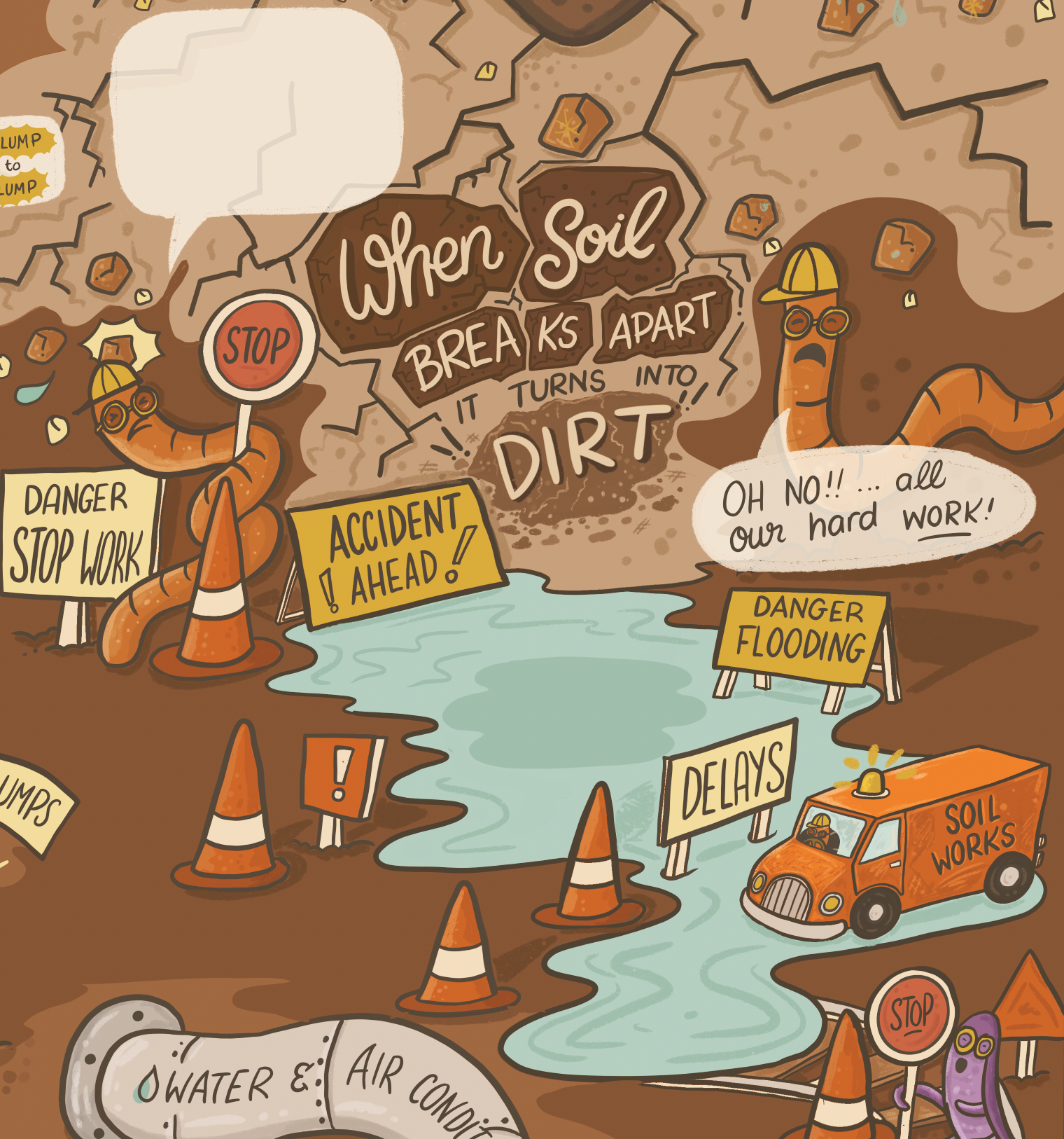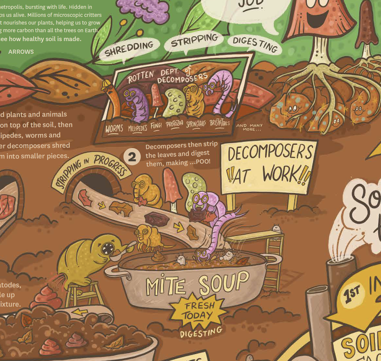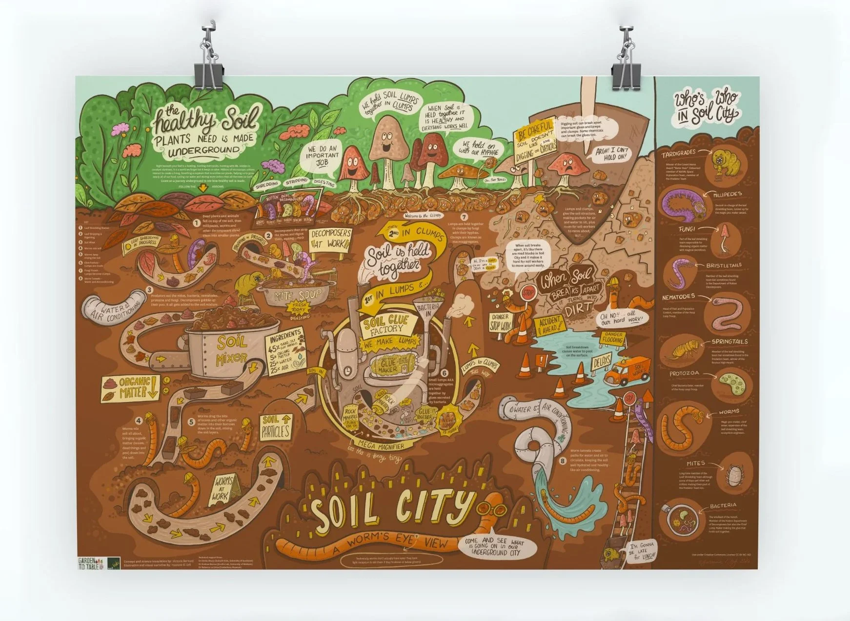 Right beneath us is a hustling, bustling metropolis bursting with life. This illustrated science resource takes school students underground to meet the microscopic critters that make healthy soil - and keep nearly everything alive above ground. The illustration makes the invisible world of soil science vivid, curious and hard to forget.