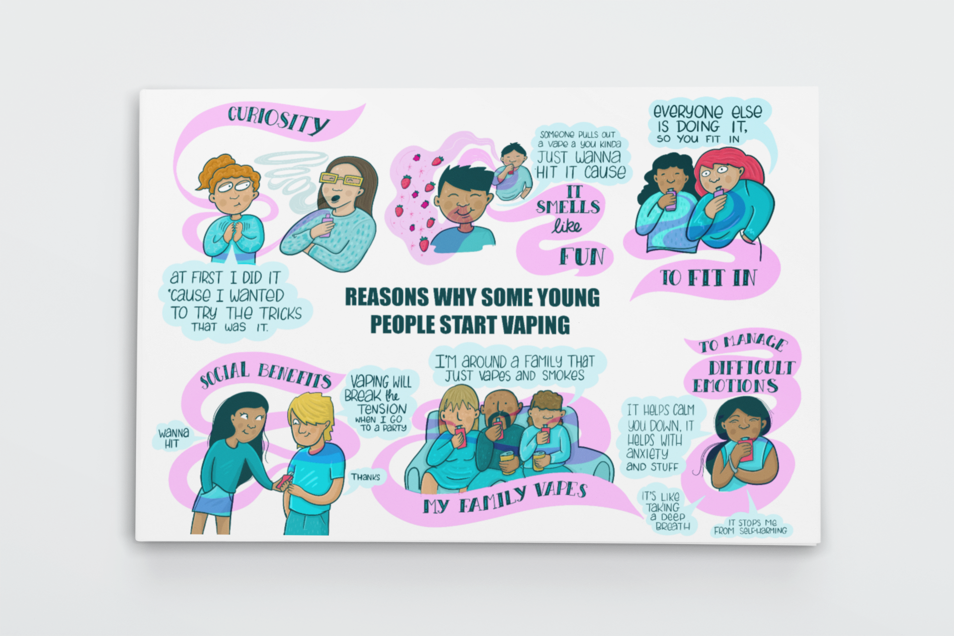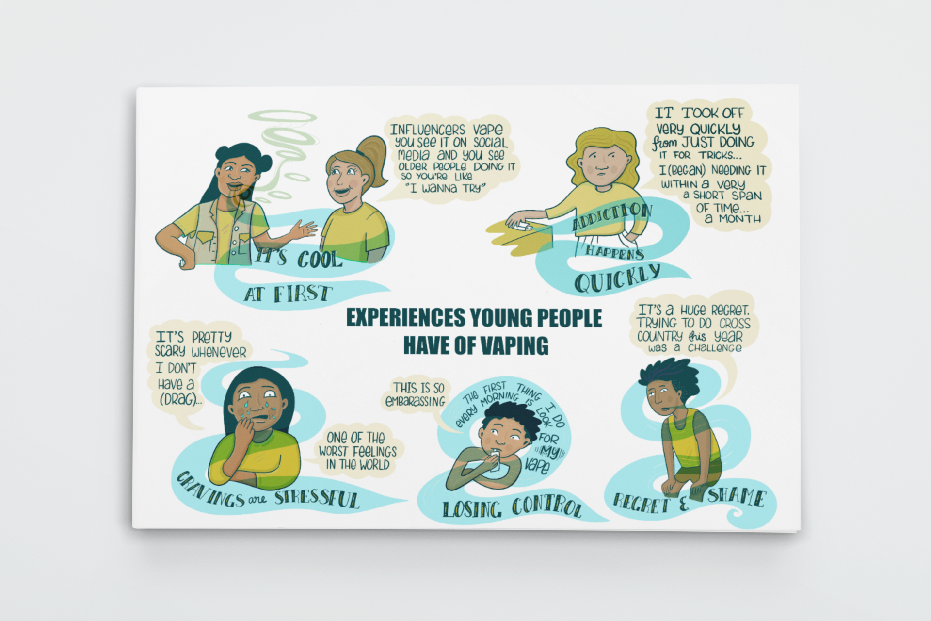 Young people's experiences of vaping are complex, personal and often hidden from view. Working with researchers at Otago University Public Health, I turned their findings into illustrated visuals that put young people, their voices and experiences at the centre.